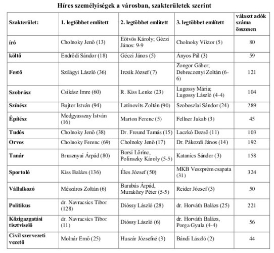 A legismertebb veszprémi kötődésű személyek listáját dr. Navracsics Tibor országgyűlési képviselő, miniszter vezeti óriási fölénnyel. Mögötte találjuk az MKB kézilabdázóit, Kiss Balázs olimpikont, Éles József egykori kézilabdázót és Porga Gyula jelenlegi polgármestert.