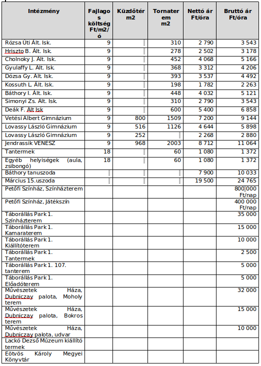 Az előterjesztés az intézmények termeinek bérlését szabályozza. A lényeg – vagyis az árak – az alábbi táblázatban láthatók.