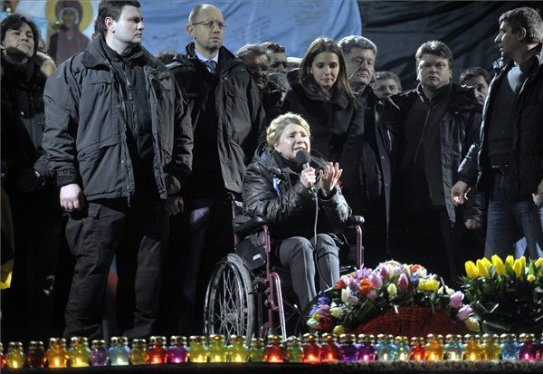 Az ukrán ellenzék aznap szabadon engedett vezéralakja kerekes székben ülve szólt a Janukovics hatalomból való távozását követelő több tízezres tömeghez. "Hősök vagytok, ti vagytok a legjobb dolog Ukrajnában" - mondta felfokozott hangvételű felszólalásában. A tüntetőket arra buzdította, hogy maradjanak a téren, és tartsanak ki a végsőkig. "Ha valaki azt mondja, hogy befejeztétek küldetéseteket, és hazautazhattok, s a többit majd mások folytatják helyettetek, ne higgyétek el egyetlen szavát sem! Addig, amíg végig nem viszitek az ügyeteket az utolsó lépésig, senkinek nincs joga elmenni innen. Azért, mert ti változtattatok meg mindet. Nem a politikusok, nem a képviselők és a nem a külvilág. Senki rajtatok kívül ezt nem tudta volna véghezvinni" - hangsúlyozta.