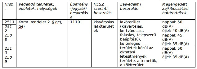 - a 8200 Veszprém, 2511 hrsz.; védendő területek, épületek, helyiségek : Korm. rendelet 2. § qc, qh); építmény-jegyzéki besorolása: 1110; HÉSZ szerinti besorolás: kisvárosias lakóterületek; zajvédelmi besorolás: lakóterület (kisvárosias, kertvárosias, falusias, telepszerű beépítésű), különleges területek közül az oktatási létesítmények területe, a temetők, a zöldterület; megengedett zajkibocsátási határértékek: nappal: 50 dB(A) / éjjel: 40 dB(A),