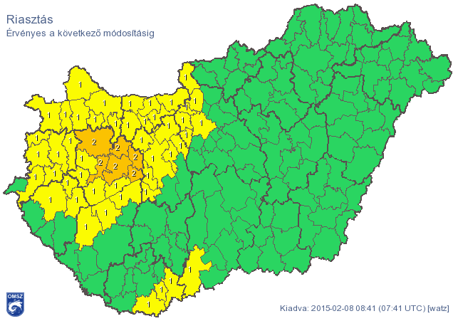 Az Országos Meteorológiai Szolgálat a pápai, a zirci, a várpalotai, a veszprémi, az ajkai és az almádi járásra is másodfokú riasztást adott ki, a megye többi területén elsőfokú riasztás van érvényben.