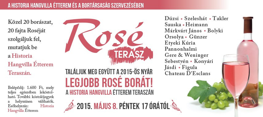 Közel 20 borászat 20 fajta Roséját szolgáljuk fel,mutatjuk be a Historia Hangvilla Étterem Teraszán. Találjuk meg együtt a 2015-ös nyár legjobb rosé borát! A Rosék: Dúzsi,Szeleshát, Takler, Sauska,Heimann, Márkvárt János, Bolyki, Orsolya,Günzer, Etyeki Kúria, Pannonhalmi, Gere & Weninger, Sebestyén, Konyári, Jásdi, Figula, Chateau D’Esclans. A belépő 1.600,-Ft mely teljes egészében lefogyasztható. További kóstolójegyek a helyszínen válthatók.