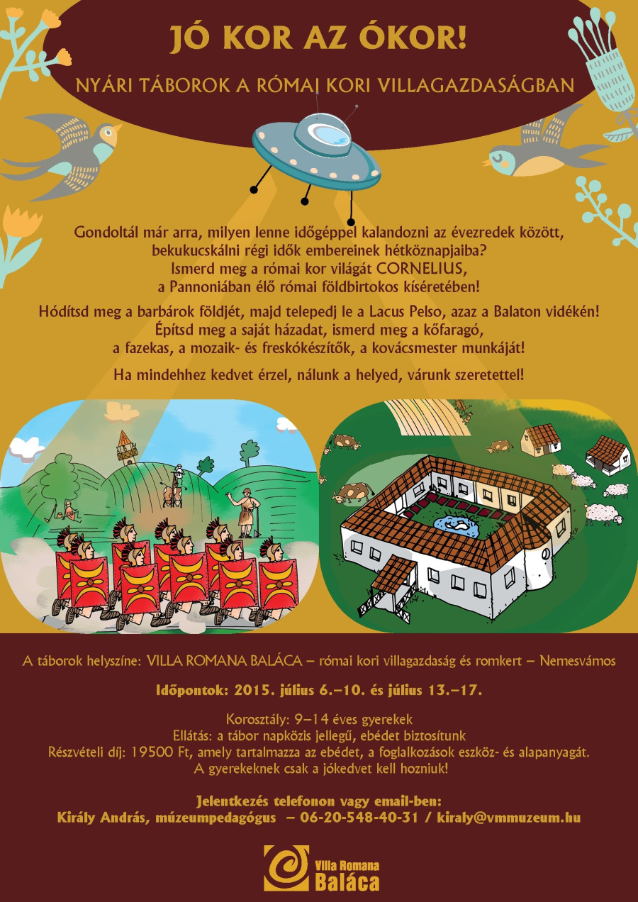 A Nemesvámos közelében található Villa Romana Balaca területén ókori római mesterségekkel ismerkedhetnek meg a résztvevők a tábor ideje alatt, így a mozaikkészítő, a fazekas, a kovács, a sírkőkészítő és a pék munkájába is belekóstolhatnak, emellett pedig biciklitúra is vár a gyerekekre – a foglalkozásokat múzeumpedagógusok mellett a mesterségek igazi szakemberei tartják.