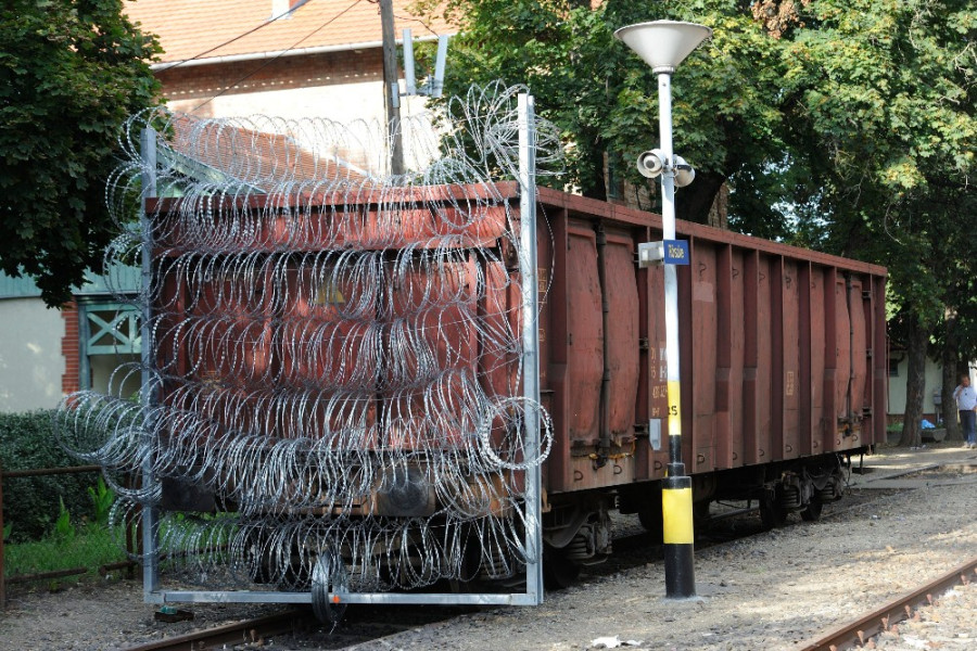Az állomás egyik külső vágányán hétfő délután egy régi, bordó tehervagon állt, amely egyik végére a határzár építése során is használt horganyzottacél-oszlopokból készült keretet erősítettek. Az acélgerendákra hét sor - a gyorstelepítésű drótakadálynál és a határzár kerítéseinek tetején is használt - NATO-drót került.