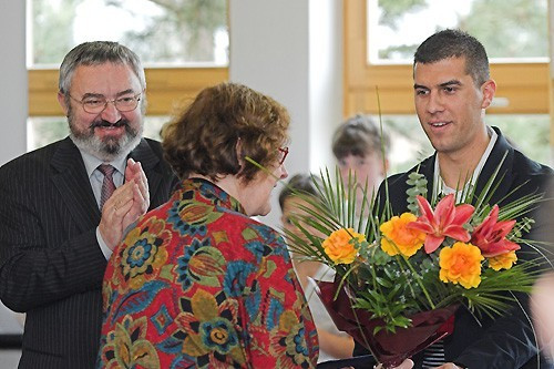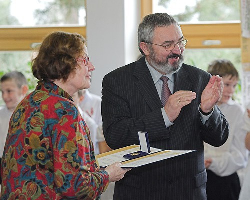 Mihalovics Péter önkormányzati képviselő, megköszönve a tanárnő eddig munkáját tavaszi színekben pompázó virágcsokrot adott át az ünnepeltnek, Debreczenyi János pedig, Giza Berger munkájának elismeréséül átadta neki Veszprém Városért arany fokozatú érdemrendet majd Veress József igazgató és dr. Albert Vendel, a megyei német kisebbségi önkormányzat elnöke méltatta Berger munkásságát.