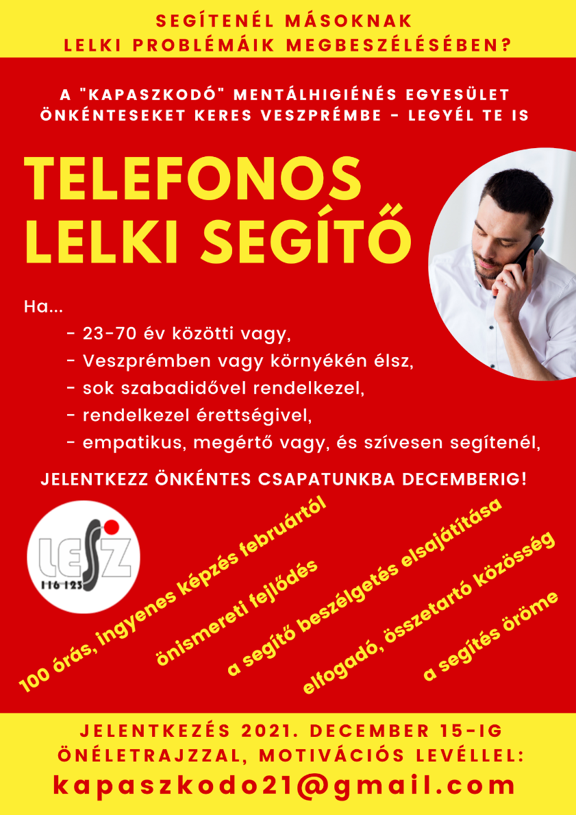 A Kapaszkodó Mentálhigiénés Egyesület képzést szervez a helyileg Veszprémben, de országos lefedettséget biztosító „Kapaszkodó” Telefonos Lelki Elsősegély Szolgálatnál folytatott segítő munka ellátására.