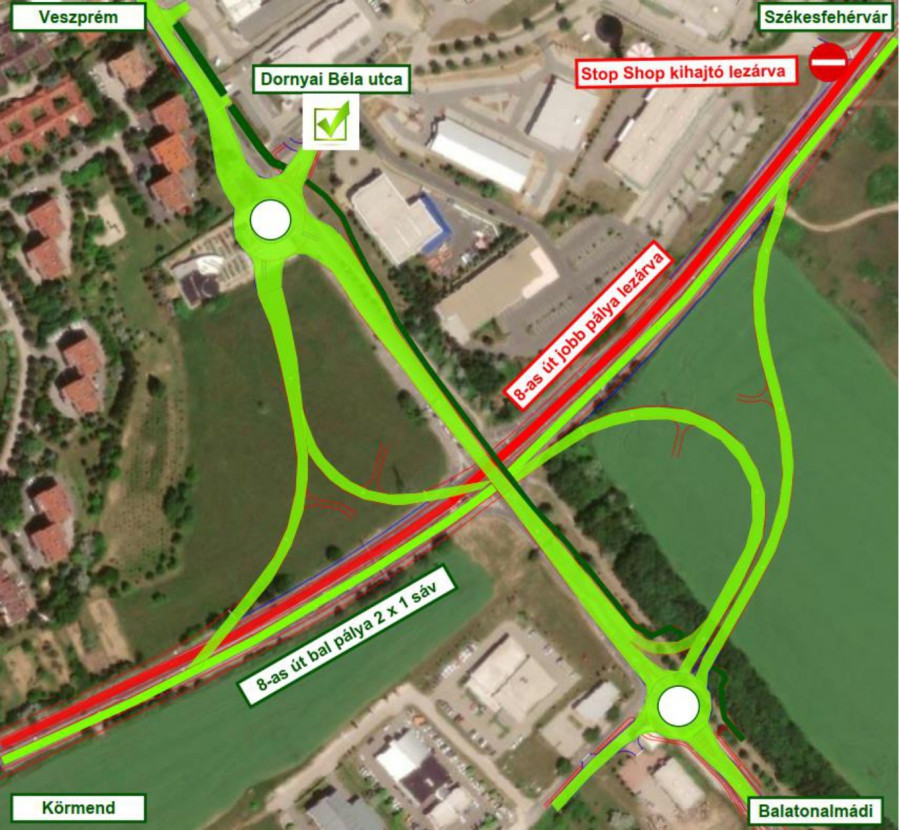 A kivitelező Strabag Építő Kft. tájékoztatása szerint január 31-én (hétfőn) lezárják a nyolcas út várost elkerülő szakaszán a Stop Shop bevásárlóközponthoz vezető, illetve onnan kihajtó utat. A bevásárlóközpont az Almádi út és a Dornyai Béla utca felől továbbra is megközelíthető marad.
