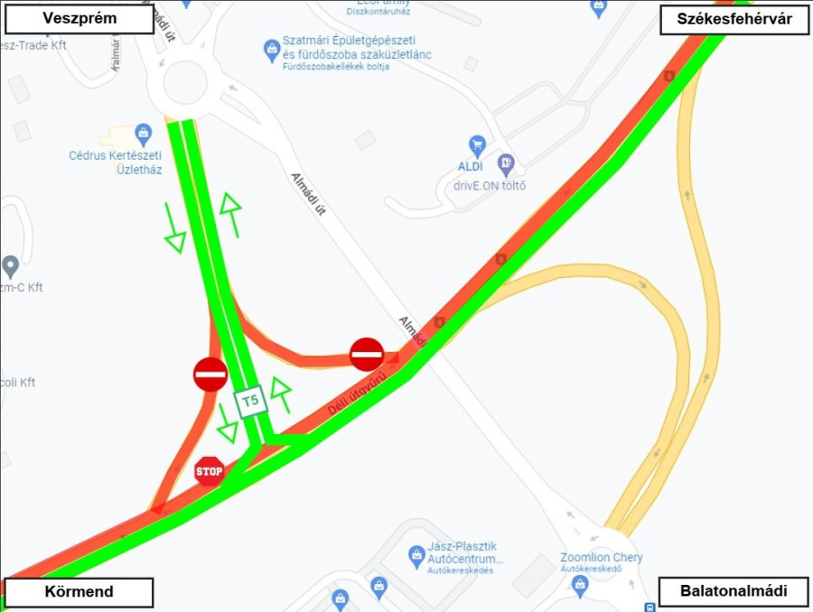 A főpálya építése miatt ideiglenesen lezárják az Almádi csomópont Veszprém felőli oldalán a 8. sz. főúthoz csatlakozó csomóponti lehajtó- és felhajtó ágat. Ennek kiváltására a két ág között kialakításra került a térképen is jelölt T5 jelű ideiglenes csomóponti ág, melyet le- és felhajtásra is igénybe tudnak venni a közlekedők. A csomópontban a 8. sz. főút továbbra is kétszer egy sávon elérhető marad mind Körmend, mind pedig Székesfehérvár irányába. A lezárás várható időtartama 2 hónap.
