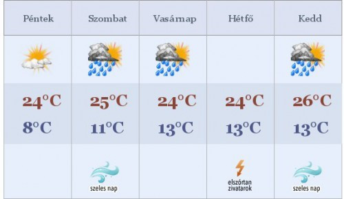 Szombaton éjjel nyugat felől gyenge felhősödés kezdődik, de csapadék még ekkor sem várható. Gyenge szél mellett 8 és 12 között alakulnak a minimumok.