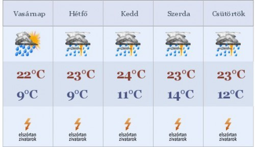Vasárnap reggelre délnyugat, nyugat felől csökkenni kezd a felhőzet, ám napközben továbbra is számíthatunk esőre, záporesőre, északon, északkeleten akár zivatarokra is. A szél gyenge marad, csak a zivatarok környékén erősödhet meg. A legalacsonyabb hőmérsékletek 7 és 12°C körül várhatóak, napközben 18-23°C várható.