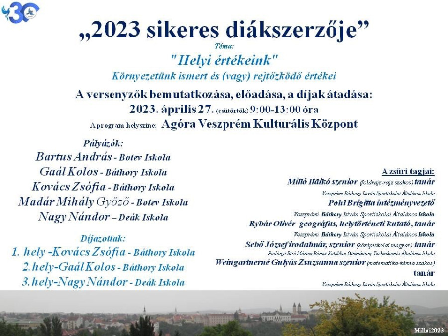 A zsűri a nyilvános előadáson bemutatott PowerPoint prezentációkat is értékelve hozta meg döntését. Az írásbeli (online beadott) feladatok és a bemutatók pontszámai alapján alakult ki a díjazottak névsora. A „2023 sikeres diákszerzője” díjazottai: 1. hely: Kovács Zsófia, 2. hely: Gaál Kolos, 3. hely: Nagy Nándor.