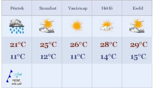 Péntekre virradóra egy hidegfront éri el az ország nyugati részét, így ott záporeső, és megélénkülő északnyugati szél várható, másutt ekkor még elszórtan fordulhat elő csapadék.