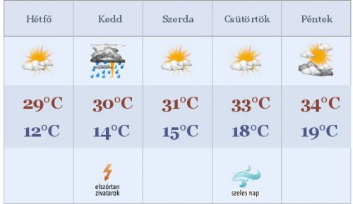 Hétfőre sem változik markánsan időjárásunk, a reggeli órákban keleten lehet több felhő, de csapadék itt sem valószínű. A délutáni, kora esti órákban nyugaton, északnyugaton egy-egy záporeső, esetleg zivatar kialakulhat. A szél gyenge marad. Hajnalban 9-14°C közé hűl a levegő, napközben 25-30°C várható.
