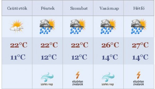 A hűvös hajnalt mérsékelt felmelegedés követi, 17 és 22 fok közé melegedhet a levegő. A mérsékelt északnyugati szelet helyenként élénk széllökések kísérhetik. Pénteken reggel sem kell számottevő csapadékra számítanunk, északkeleten fordulhat elő kisebb eső. A Tiszántúlon közepesen, másutt gyengén felhős égboltra tekinthetünk majd fel. A legalacsonyabb hőmérsékletek 10-15°C körül alakulnak majd, a légmozgás mindenhol gyengülni fog. Délelőtt a Dunántúlon előfordulhatnak élénk széllökések.