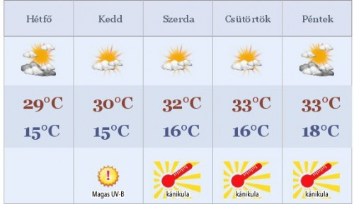 Hétfőre virradóra kevés lesz a felhő felettünk, csak északnyugaton fordulhat elő egy-egy zápor. Többfelé leáll a szél, de máshol is csak gyenge légmozgás várható. Sokfelé párássá válik a levegő, helyenként köd is képződhet. Hajnalban 13-16 °C-ig csökken a hőmérséklet. Napközben nyugaton is csökken a felhőzet, mindenütt többórás napsütés valószínű. Gyenge vagy mérsékelt lesz az északnyugati szél. Délután az Északi-középhegységben és a nyugati határszélen záporok alakulhatnak ki, néhol zivatar is lehet. 26-30 °C-ig melegszik a levegő. Kedden reggel napos időre ébredhetünk, csapadék sehol sem várható. A legalacsonyabb hőmérséklet 12 és 17 °C között valószínű, a változó irányú szél mindenhol gyenge lesz.