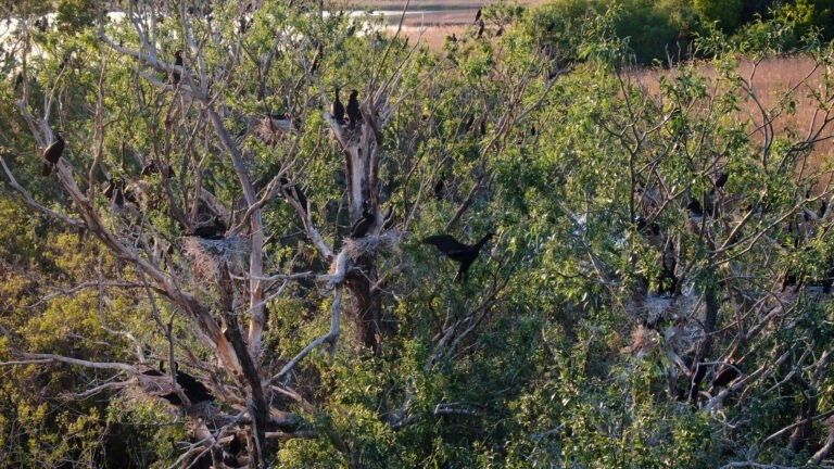 Igen örvendetes, hogy a horgászok aggódnak a fákért, bár amikor horgászhelyeket alakítanak ki a parti növényzet és a nádas elpusztításával, akkor valahol túlságosan mélyen szunnyadhat ez az aggodalom. A jó hír az, hogy a kárókatona ürülékétől nem pusztul el sem a fűz, sem a nyárfa. A Tiszavalki-medence évtizedek óta meglévő, nagy kárókatona-telepéről mutatok néhány képet, melyeken jól látszik, hogy a fészkelési szezon végén, amikor a fiókák már nagyok, a telep fái vígan zöldellnek.