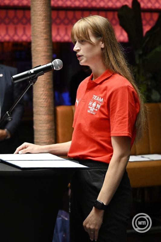 Az eskü szövegét a színpadon Mátó Sára, a 2023-as csengtui egyetemi játékokon bronzérmes gátfutó mondta el.