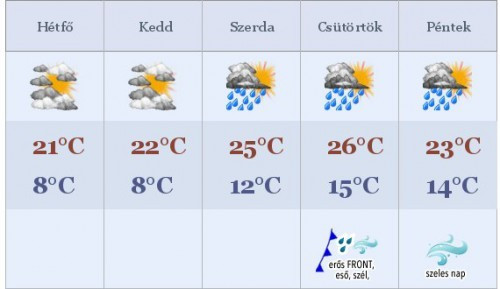 Napközben erősen felhős vagy borult lesz az ég, ott többfelé várható eső, zápor. Északon pár órás napsütés valószínű, néhol záporok alakulhatnak ki. Gyenge vagy mérsékelt lesz a változó irányú szél. 15-20 °C-ig emelkedik a hőmérséklet.