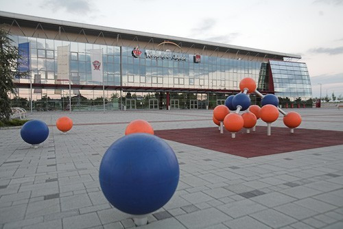 A Veszprém Aréna előtti téren érdekes színfoltot alakítottak ki a szakemberek: színes gumigömbök és egy gúla alakú játékkomplexum várja a sportolni vágyó kicsiket és nagyokat.