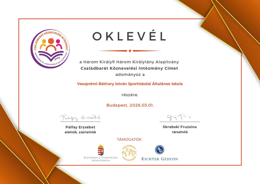 Az idei évben a tavalyinál is több, összesen 180 pályázat érkezett be. A kitüntetést azok a köznevelési intézmények kaphatták, amelyek pályázati anyagukban hiteles módon mutatták be közösségépítő működési modelljüket, családbarát jó gyakorlataikat. Az iskola már tavaly is büszkén viselhette a címet, az idei elismerés pedig még nagyobb jelentőséggel bír: a cím újbóli elnyerése azt jelzi, hogy a Báthory nem egyszeri kezdeményezésekkel, hanem következetes, rendszerszintű munkával érdemelte ki az elismerést.