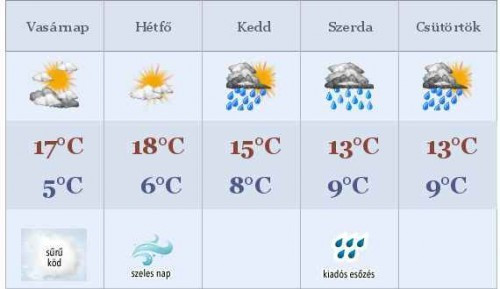 Napközben már csak nyugaton valószínű felhősebb idő, az ország nagy részén azonban sok napsütésre, szép őszi napra készülhetünk, csapadék nélkül. A délkeleti szél a Dunántúlon megélénkül, máshol gyenge vagy mérsékelt marad a légmozgás. 13 és 18 °C közé melegszik a levegő.