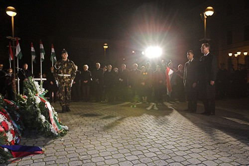 Az összegyűlt emlékezők igazán szép műsort hallhattak és láthattak tegnap este. A zenéről a HM Légierő Zenekar gondoskodott, Oberfrank Pál Vas István: Az új Tamás, Kéri Kitty Faludy György: Kihallgatás és Szalma Tamás Ady Endre: Imádság háború után című versét adta elő.
