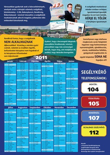 Ennek szellemében Veszprém Megyei Jogú Város Önkormányzata Bűnmegelőzési és Közbiztonsági Bizottsága támogatásával készített a Veszprémi Rendőrkapitányság az idősek számára színes éves A/3-as méretű naptárt, melyen a trükkös lopások jellemző elkövetési módjai, a megelőzési lehetőségei, illetve az ingyenesen hívható segélykérő számok szerepelnek.
