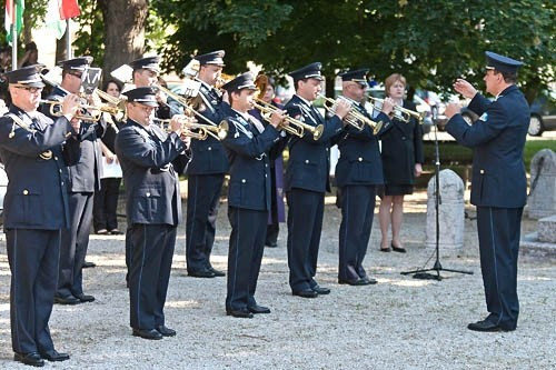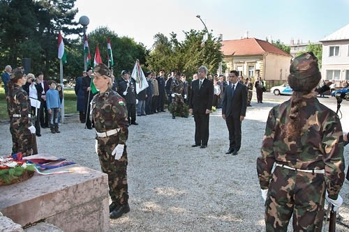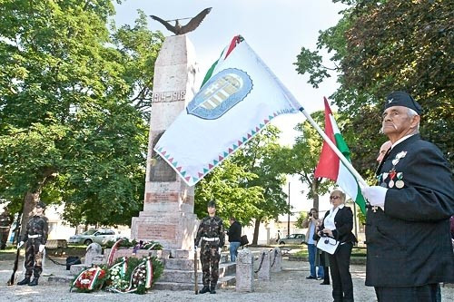 A Magyar Légierő Zenekarának dallamaira helyzeték el a megemlékezés koszorúit – többek között – a honvédség, a rendőrség, a katasztrófavédelem, a Pannon Egyetem képviselői az emlékműnél. Veszprém városának nevében Némedi Lajos alpolgármester és Óvádi Péter képviselő tisztelgett a háború hősei előtt.