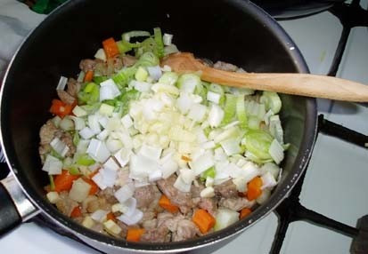 Hozzádobtam egy apróra vágott vöröshagymát, három kockázott zsenge répát, egy kisebb zellergyökeret (a Mester kedvence volt), egy karalábét, pár gerezd fokhagymát, meg pár marék darabolt újhagymát.
