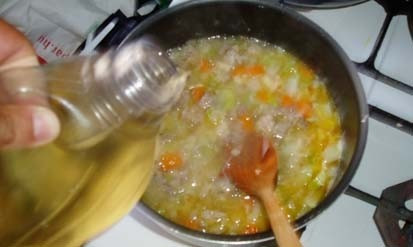 Összepároltam, hozzálöttyintettem 2 dl vizet. Tíz perc fortyogás után utánaküldtem 2 dl száraz csopaki rizlinget.