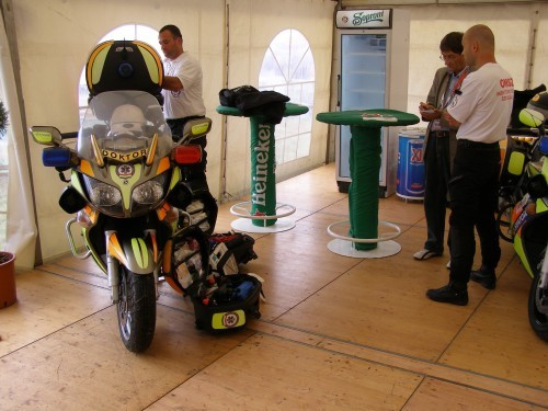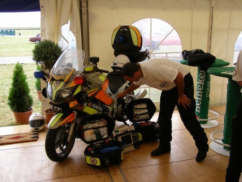 Visszatérve a járművekre: az 1300 köbcentis Yamahák (a rendőrség is ezeket használja) gyakorlatilag mindennel fel vannak szerelve: infúzió, a köznyelvben csak „újraélesztőnek” titulált műszer-együttes, légút biztosító, kötszerek stb.