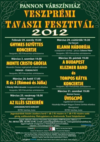 A Pannon Várszínház időn ötödik alkalommal rendezi meg a Veszprémi Tavaszi Fesztivált február 29. és március 31. között három vendégelőadással – közte táncszínházi bemutatóval –, három koncerttel és egy saját ősbemutatóval. A hét egész estés produkció közül kettőt az Inotai Retro Színházban tartanak meg, a többinek az egykori Séd Filmszínház ad helyet. – Olyan neves együtteseket és előadókat hívtunk vendégül, mint a Ghymes, Bródy János, Scherer Péter, Tompos Kátya és a Budapest Klezmer Band – ismertette sajtótájékoztató keretében Vándorfi László, a Pannon Várszínház igazgatója kedden délelőtt.