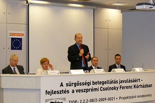 A „Sürgősségi betegellátás javulásáért – fejlesztés a veszprémi Csolnoky Ferenc kórházban” című projekt záró eseményén az intézmény főigazgatója, dr. Rácz Jenő mindenkinek megköszönte a munkát. Elmondta, ez az első olyan projekt az Új Széchenyi Terv keretében, amit a gyakorlatban is át tudtak adni. Új dimenziót nyitnak meg ezek a fejlesztések a veszprémi kórház történetében éppúgy, mint a sürgősségi ellátás fejezetében. Fontos, hogy előretekintsünk, építsük a kórházat – emelte ki a főigazgató.
