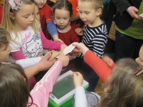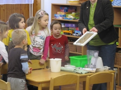 Az IKSZ környezetvédelmi koordinátora, Izsákné Simon Adrienn szemléletes bemutatót tartott egy turmixgép segítségével a gyerekeknek arról, hogyan is készítenek újrahasznosított papírt a kartondobozokból.