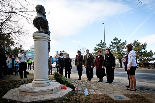 Az épület előtt álló Kossuth-szobornál koszorút helyezett el a városi önkormányzat nevében Brányi Mária alpolgármester, az iskola képviseletében Cz. Nagyné Bándi Klára igazgató, az intézmény két igazgatóhelyettese: Nagyné Dömös Erika és Nagyné Czaun Marianna, a diákönkormányzat két tagja, valamint Sándor László, a Rózsa Úti Általános Iskola igazgatója.