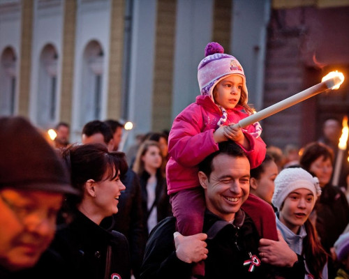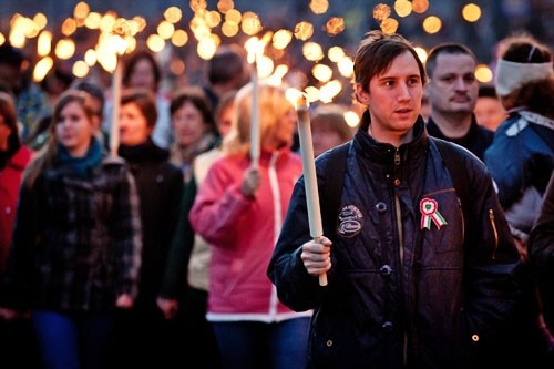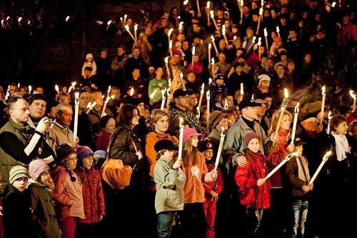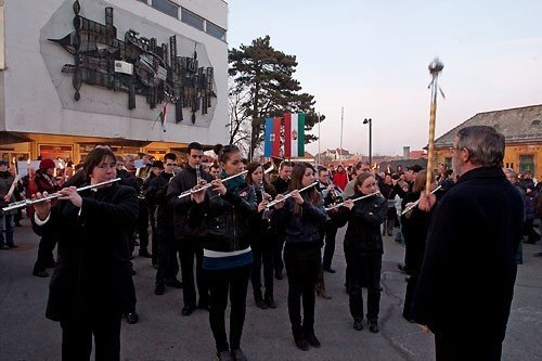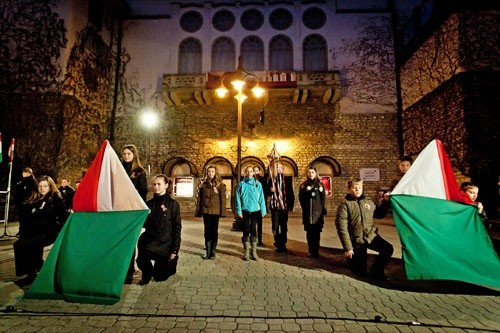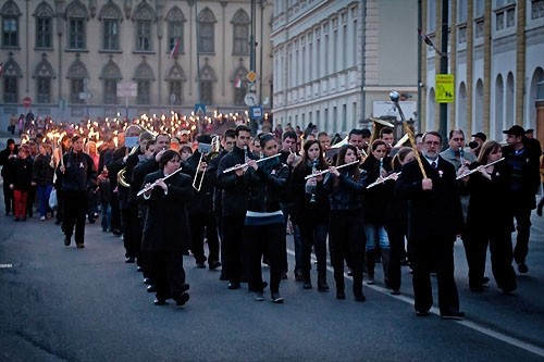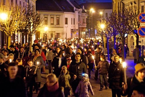 Az ünneplő tömeg estefelé a VMK előtt gyülekezett, ahonnan fáklyás felvonulás vette kezdetét az Óváros-térig a Veszprémi Ifjúsági Fúvószenekar vezetésével.