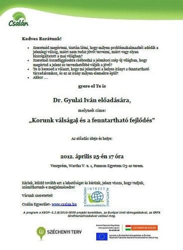 Dr. Gyulai Iván ökológus, a fenntartható fejlődés egyik legjelentősebb magyar gondolkodója tart előadást április 25-én, szerdán 17 órától a Pannon Egyetemen.