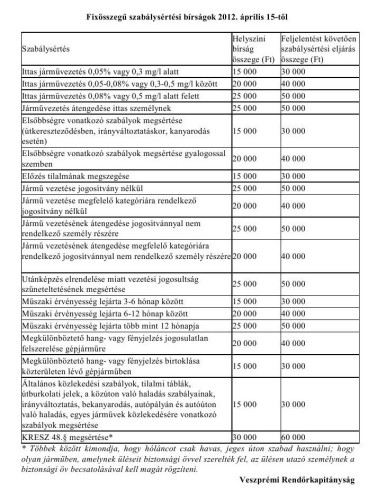 Egyes közlekedési szabálysértéseknél bevezetik a helyszíni bírság kötelező mértékét, vagyis a fixbírságot. Ennek kétszerese egyezik meg a szabálysértési eljárásban kiszabott bírsággal. Például egy záróvonal átlépése esetén a fixbírság összege 15 ezer forint, szabálysértési eljárásban 30 ezer forint. A szabálysértési eljárásban kiszabott bírság magasabb összege az eljárás lefolytatásának költségeivel indokolt. A helyszíni bírság összege általában 5 ezer forinttól 50 ezer forintig, 6 hónapon belüli ismételt elkövetés esetén pedig 70 ezer forintig terjedhet, kivéve a fixbírság hatálya alá tartozó szabályszegéseket. A járművezetéstől eltiltás továbbra is a szankciórendszer részét képezi.