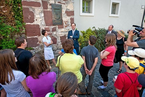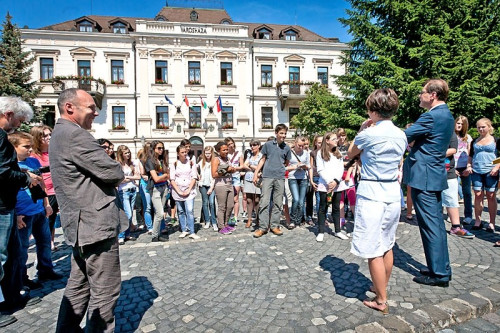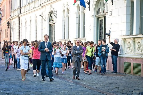 Dr. Navracsics Tibor felhívta a figyelmet a tér egyik leghíresebb épületére, a Pósa-házra, majd a diákok csoportját a vár felé irányította. Elhangzott, hogy Veszprém a legmagasabban fekvő megyeszékhely Magyarországon, valamint bemutatta a várban található épületeket, emléktáblákat is, mindezeket pedig a fiatal hallgatóság lelkes érdeklődése kísérte.