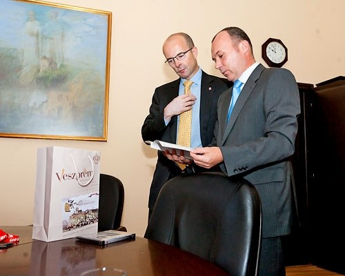 Porga Gyula ajándékcsomaggal kedveskedett vendégének, amely egyebek mellett veszprémi turisztikai kiadványokat, mise bort, valamint a város címerével díszített Ajka kristály poharat tartalmazott.