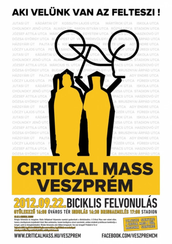Szintén szombaton tartják meg a hagyományos Critical Mass kerékpáros felvonulást Veszprémben. A résztvevők a közlekedési célú, mindennapos kerékpározás népszerűsítéséért, a várost érő forgalmi terhelés, és szmog csökkenéséért demonstrálnak. Szeretnék, hogy Veszprémben emelkedjen a kerékpárral közlekedők aránya, és ne csak a civilek, hanem a város vezetői is tegyenek ezért.