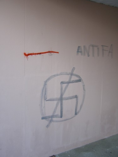 A rajzolót nagy valószínűséggel megzavarhatták, mert a szövegből csak a képen látható töredék (antifa) sikeredett. Hadd javasoljuk az ismeretlen rajzolónak, üssön föl egy lexikont, s nézze meg a különféle keresztekről készült jelmagyarázatot. Lehet, hogy elröstelli magát, de az sincs kizárva, hogy saját maga mossa le tettét.