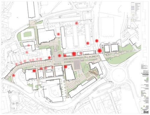 A mostani várostérképen piros színnel jelőlve a feltételezett pincék helyzete