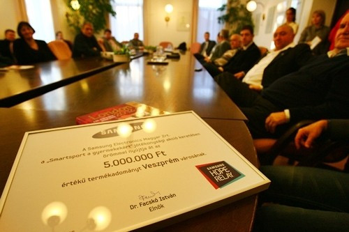 Minden megyeszékhely 5–5 millió forint értékű termékadománnyal segítheti a helyi szervezeteket. Veszprém polgármesterének a városházán hétfőn adta át jelképesen az ajándékokat Sebestyén Péter, a Samsung Magyarország Zrt. alelnöke a városi sportszervezetek képviselőinek jelenlétében.