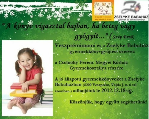 A Veszprémimami és a Zselyke Babaház közös gyermekkönyvgyűjtést kezdeményezett. Az összegyűlt, jó állapotú könyvekkel a Csolnoky Ferenc Megyei Kórház Gyermekosztályát kívánják meglepni. A könyveket 2012. december 18-ig gyűjtik a Zsejke Babaházban, a Vajda János utca 6. számmal szemben.