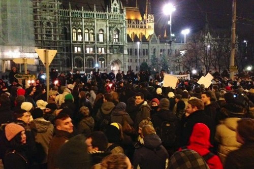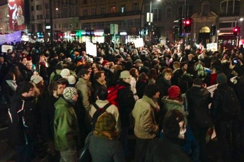 Az Origo tüntetőkkel vonuló tudósítója azt jelentette, hogy a tüntetők a Kossuth térre indultak a Kiskörúton, ahol minden sávot elfoglalnak. A tömeg mintegy 400-500 fősre duzzadt, többen a 47-es, 49-es villamosokról leszállva csatlakoztak a tüntetőkhöz, de az Origo tudósítója szerint már vannak néhányan, akik inkább beülnének valahová, mert nagyon fáznak. A Kálvin térnél egy rendőrautó próbált a tömeg elé vágni, de a dugó miatt ez nehézkes volt. Tudósítónknak a tüntetők azt mondták, azért mennek a Kossuth térre, hogy felolvassák a délutáni fórumon elfogadott öt pontot.