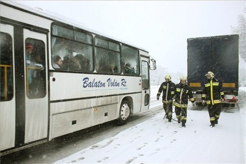11:50 - MTI Fotó: Nagy Lajos - Kamionmentésre induló tűzoltók mellett halad el egy veszprémbe tartó autóbusz a 8-as számú főúton 2013. január 17-én. Az este kezdődött újabb havazás miatt a veszprémi körgyűrű több szakasza járhatatlan az elakadt kamionok miatt. A nagymennyiségű hó a városban is megneheziti a közlekedést.