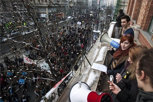 A Hallgatói Hálózat és a Középiskolai Hálózat által szervezett demonstráció részvevőinek egy része az egyetem Múzeum körúti A épületében, a kari nagyelőadóban gyűlt össze, és itt a tiltakozás egyik rendezője elmondta: az egyetemek autonómiája érdekében nyomásgyakorlási eszközként "visszafoglalják az egyetemet", "blokádot hirdetnek".