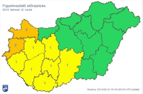 Országos Meteorológiai Szolgálat: Figyelmeztető előrejelzés Magyarország területére 2013.02.13. szerda éjfélig