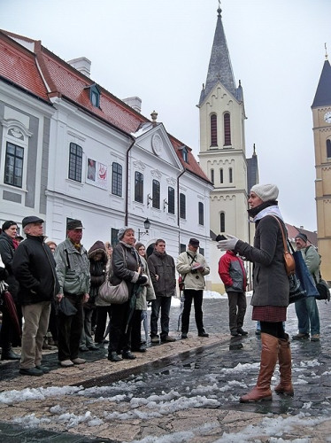 A városnézést Ferenczik Brigitta vezette, aki szilveszterkor is körbekalauzolta az embereket a várban. Amint a harangjáték eljátszotta Csermák Antal Sarkantyús verbunkosát megindult a séta. A várról és a környező épületekről rengeteg érdekes információt tudhattak meg az érdeklődök. Szó esett az Óváros tér történetéről, külön kiemelve a Pósa-házat. A városházánál megtudhattuk, hogy Veszprém címerének színei közül a piros az életet, a zöld pedig a kultúrát és természet közelségét jelképezi. Itt került terítékre Veszprém harcias múltja. Elhangzott, azért nem tudunk nagy várkapitányról a török időkből, mert a város akkoriban 17-szer cserélt gazdát, ez pedig lehetetlenné tette, hogy akárki is letegyen valamit a rövid szolgálati ideje alatt az asztalra.